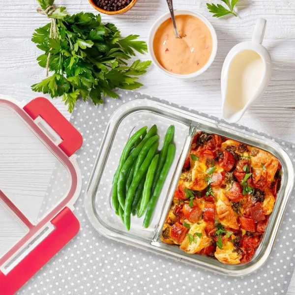 • Sklenená zapekacia miska s vekom a praktickým delením je ideálna na prípravu, zapekanie aj skladovanie jedál. Vďaka rozdelenému vnútornému priestoru umožňuje oddeliť rôzne druhy pokrmov bez ich zmiešania.