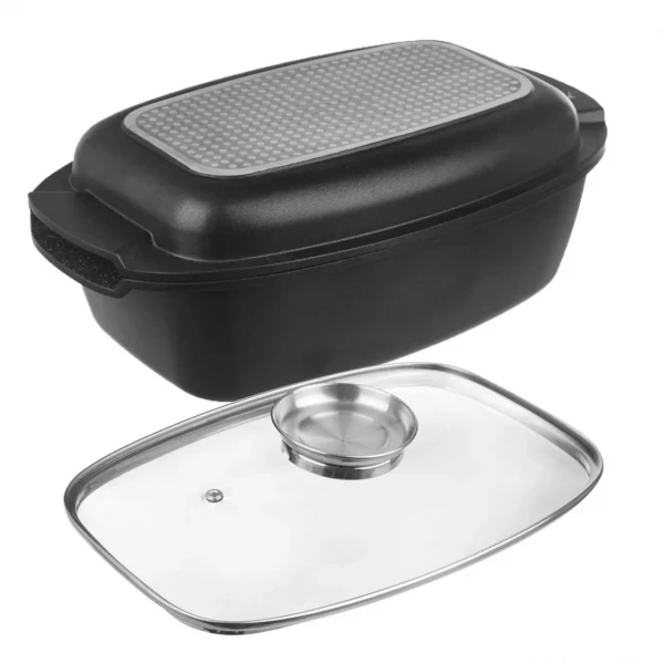 Odlievaný masívny pekáč je opatrený sklenenou pokrievkou v rozmere 31,4x20x4,5 cm, s nerezovým lemom a aróma úchytom, ktorý umožní jemné dávkovanie tekutých dochucovadiel, olejov, vína a marinád.