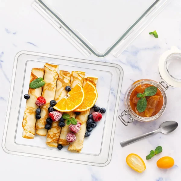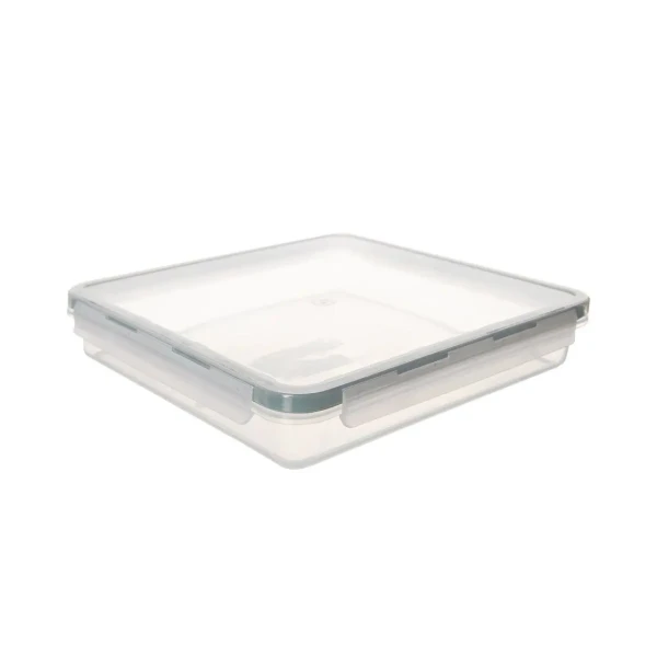 Transparentná štvorcová dóza je vďaka výške 4,2 cm ideálna  na uloženie potravín v chladničke, napr. krájaných salám a plátkových syrov, v mrazničke do nej stačí uložiť bobuľoviny zo záhradky, nadrobno nakrájanú zeleninu do polievky  a pod. Hodí sa aj na cesty alebo do práce na uloženie menších koláčikov, jednohubiek, aj drobných cukroviniek. Viečko je opatrené praktickými  klipmi a silikónovým tesnením.