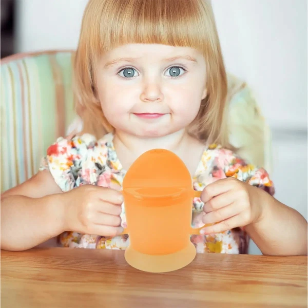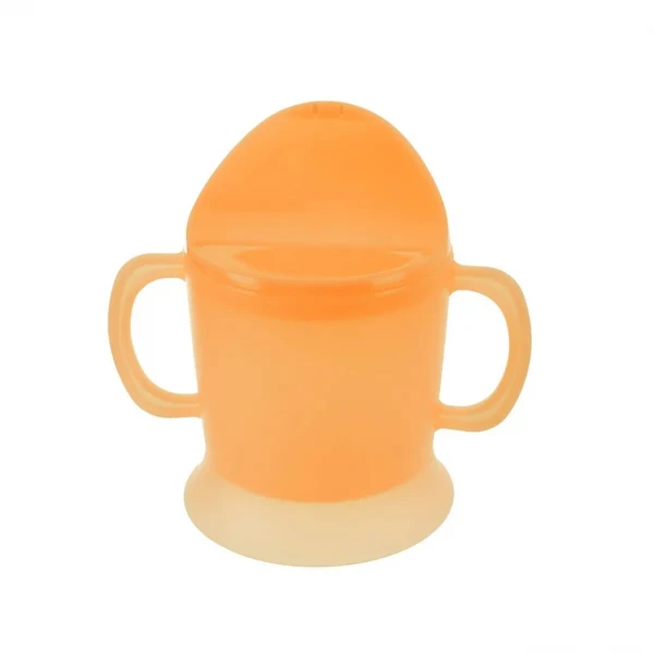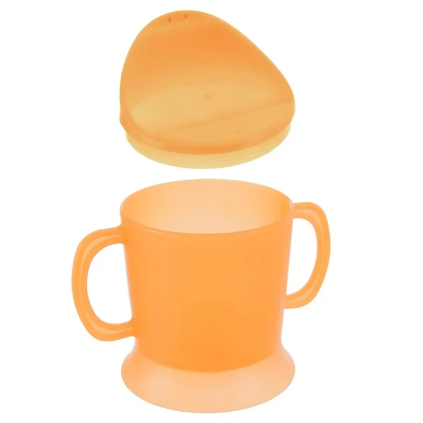 Oranžový plastový hrnček s náustkom s objemom 230 ml neobsahuje