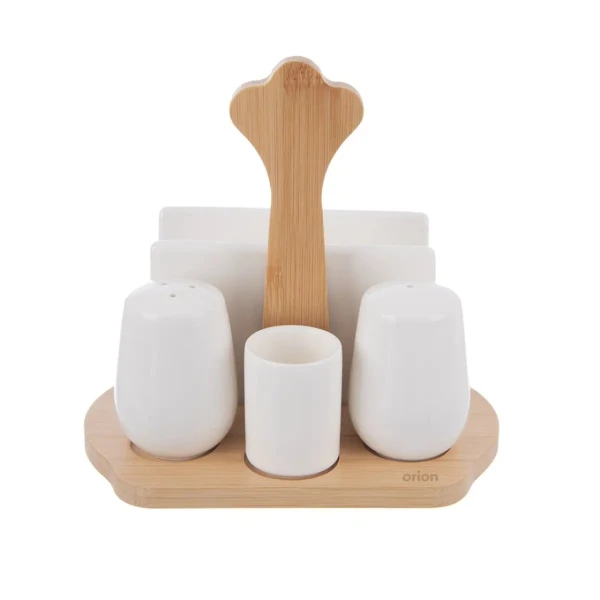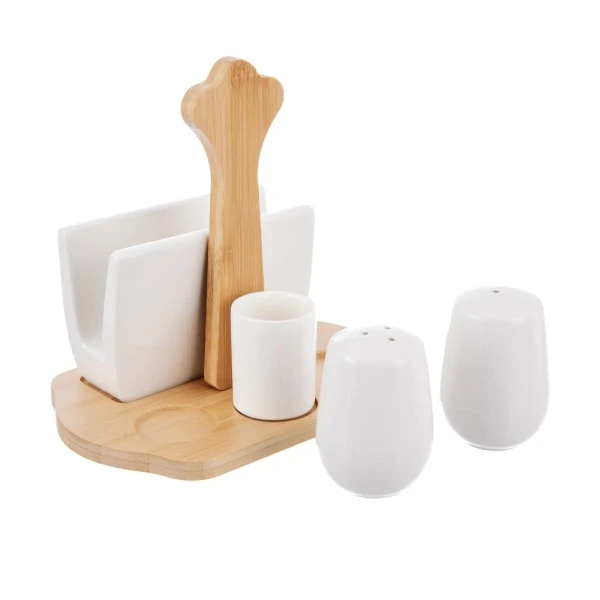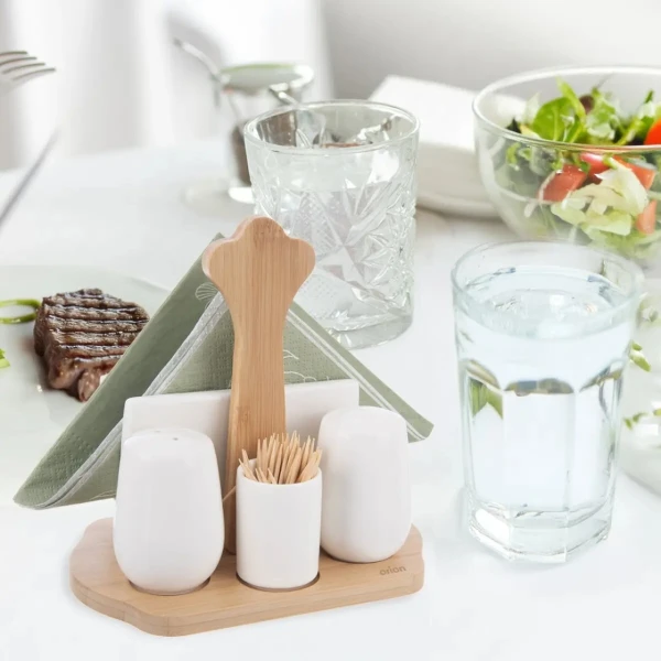 Vďaka tejto súprave budete mať všetky potrebné dochucovacie doplnky vždy po ruke. Kombinácia porcelánu a prírodného bambusu pôsobí moderne a hodí sa do každej kuchyne či jedálne.