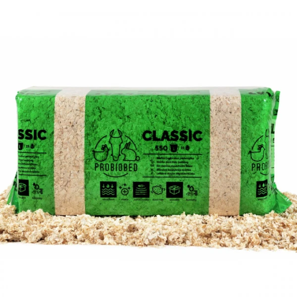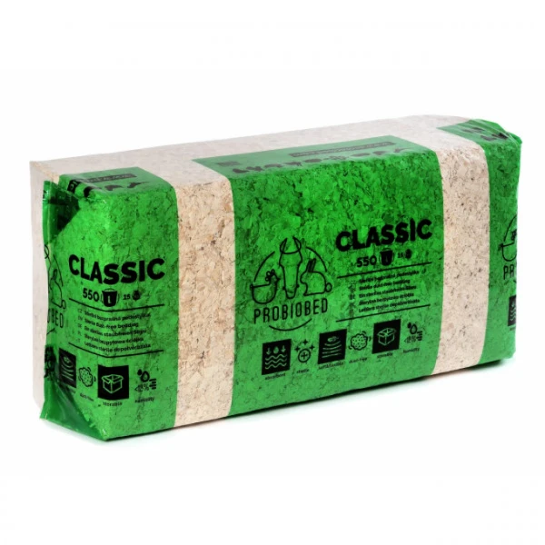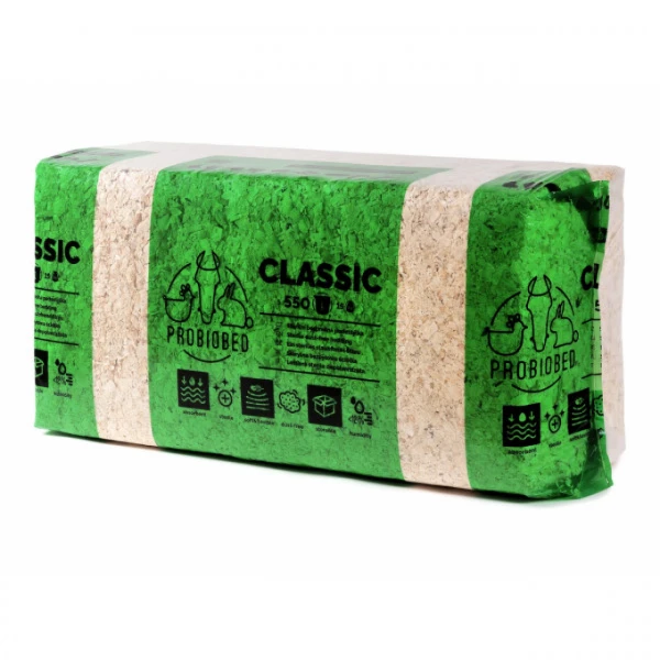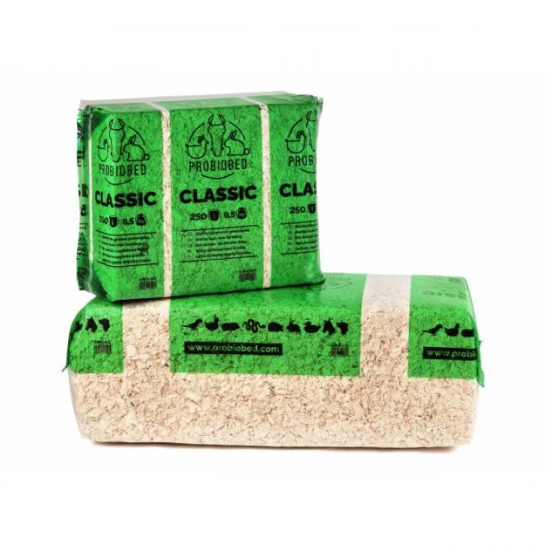 Podstieľka z drevenných hoblín Probiobed dodávaná v lisovanom balíku s rozmermi 80 x 40 x 30 cm (objem 96 l).