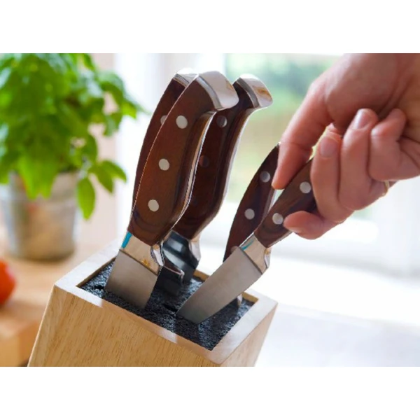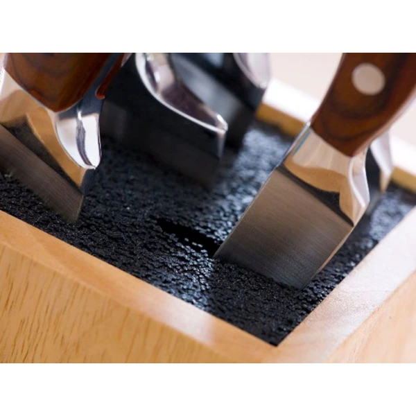 Univerzálny blok na nože je vyrobený z bambusového dreva. Deliace záložky sú vyrobené z plastu - tzv. tráva. Táto výplň Vám umožní odložiť nôž do akéhokoľvek miesta v stojane. Vhodný pre všetky druhy nožov. Vložku môžete vybrať a stojan umyť. Nadmerná voda odtečie vďaka špeciálnym otvorom na dne produktu. Napriek tomu sa však odporúča vkladať do bloku suché nože.