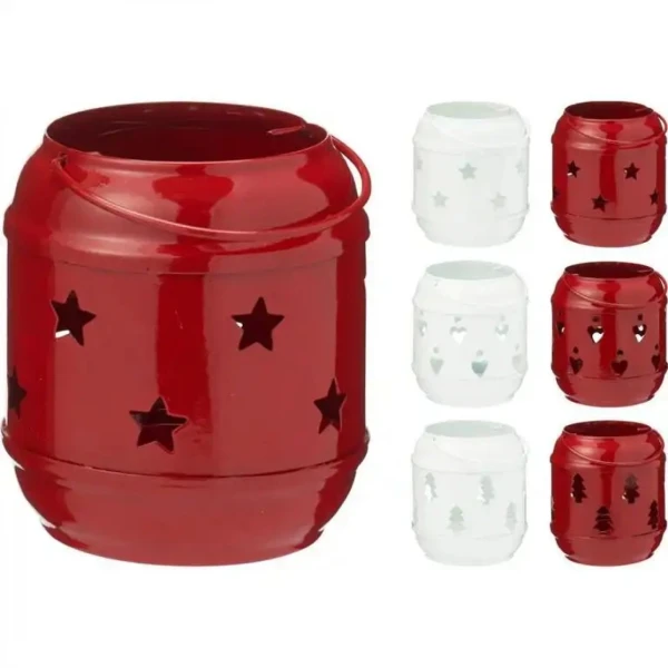 Kovový lampáš, svietnik, s rúčkou, s malými otvormi s vianočným motívom hviezda, srdce, stromček.